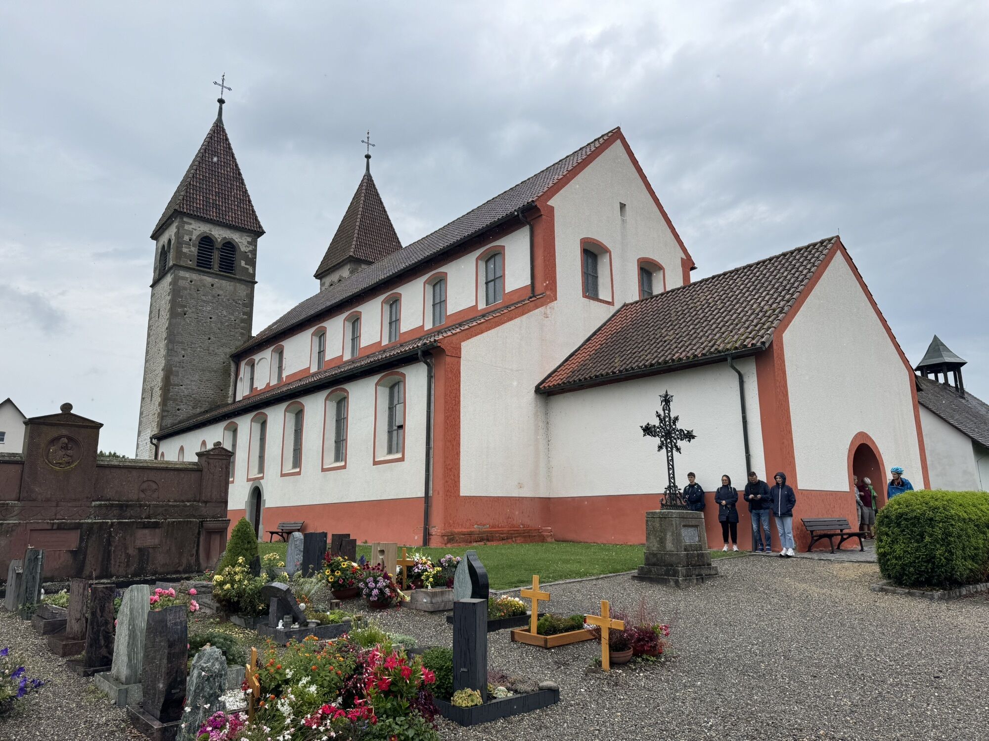 We follow the shore path until the street turns left to the church of St. Peter and Paul in Niederzell (straight ahead is prohibited for cyclists). This church is also worth a visit. Public toilets are located on Niederzeller Straße below the cemetery. From the boat landing, there is a view of Lake Gnadensee with Allensbach and past Bürgle to the Mettnau peninsula and the most famous island in the Lake Constance, the Liebesinsel (the final scene of the film The Fisherwoman of Lake Constance was filmed there).