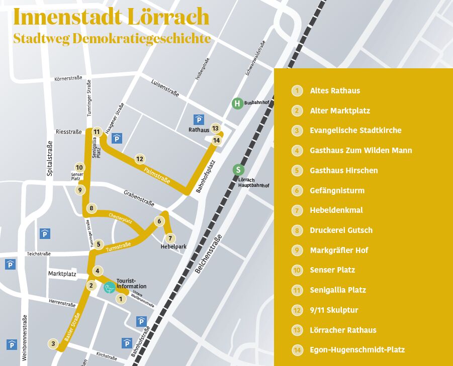 Die spannende Demokratiegeschichte unserer Stadt und unseres Landes entdecken wir an 14 Stationen in der Lörracher Innenstadt. Von der Revolution 1848/49 bis heute spannt der Lörracher StadtWeg Demokratiegeschichte den thematischen Bogen, stellt prägende Lörracher Persönlichkeiten vor und nimmt immer wieder Bezug zu den grundlegenden Werten und Rechten in unserer Demokratie.