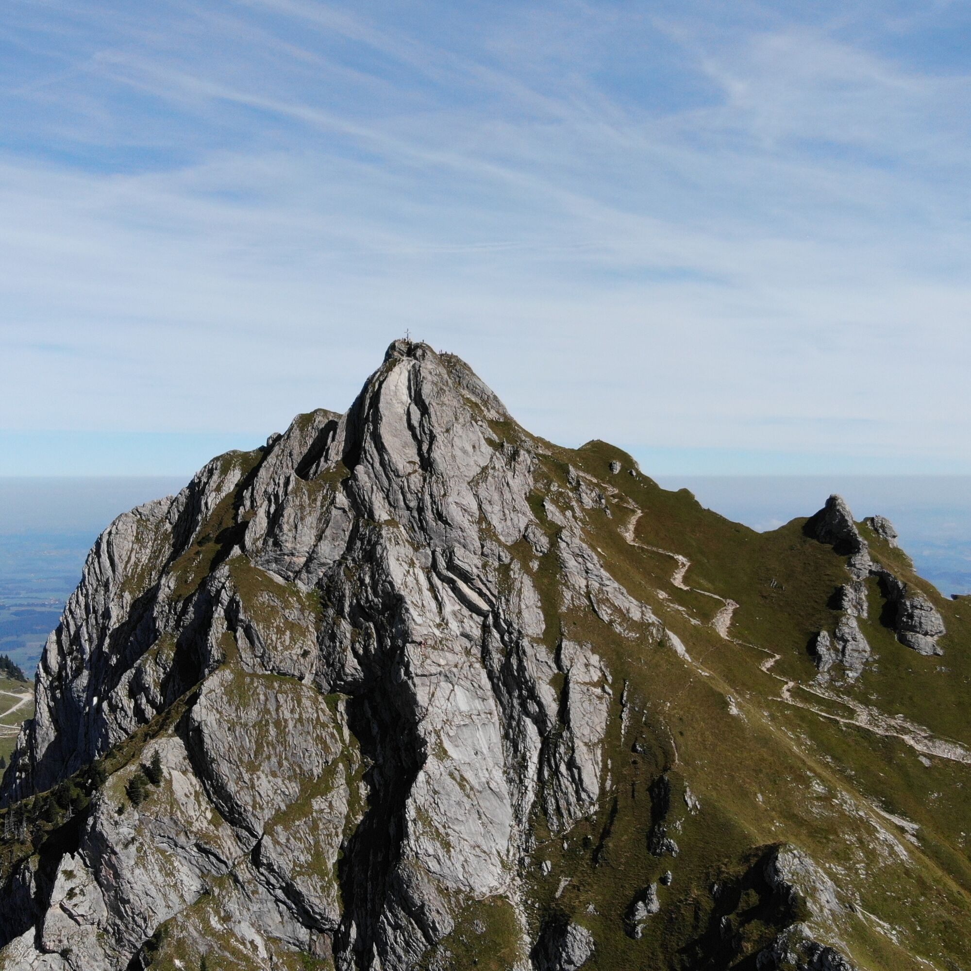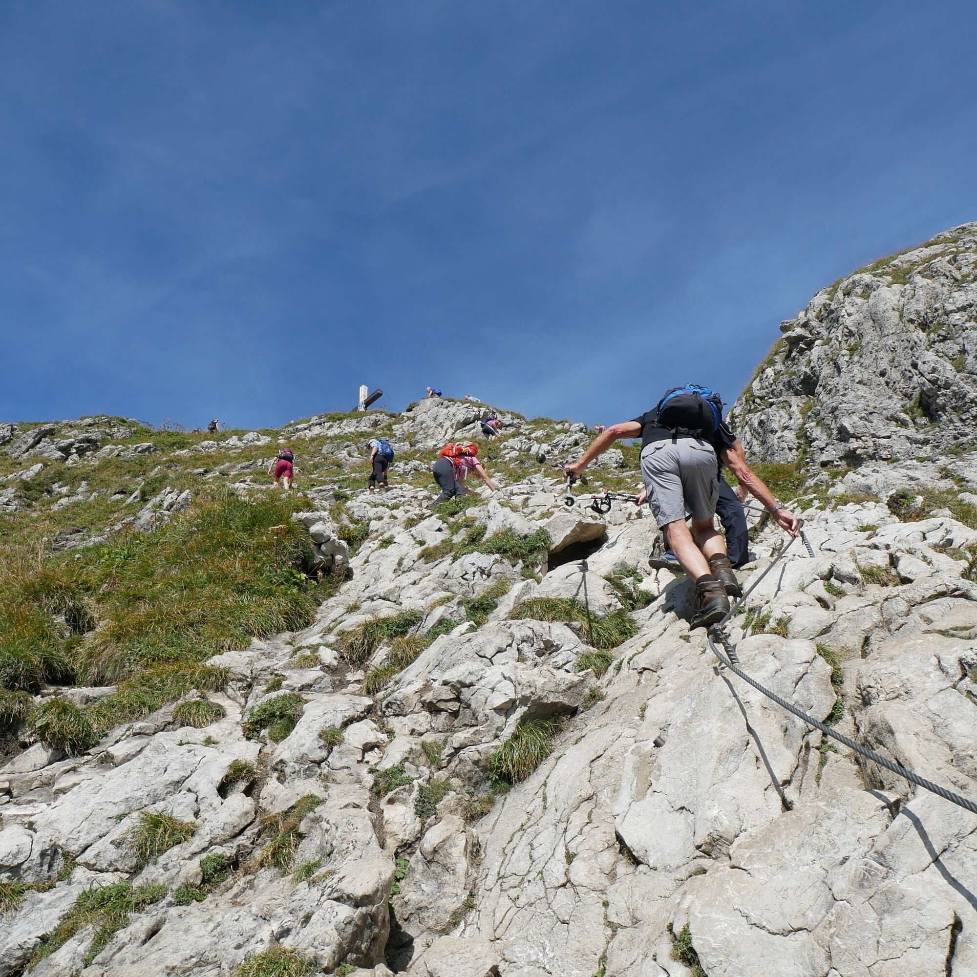 The hiking trail starts via the Hochalpe and continues along the Langen Strich towards the summit. The route offers breathtaking views of the surrounding mountains and valleys. Some parts of the trail are secured by wire ropes and require special care! Surefootedness is essential here, as the path is steep and narrow.