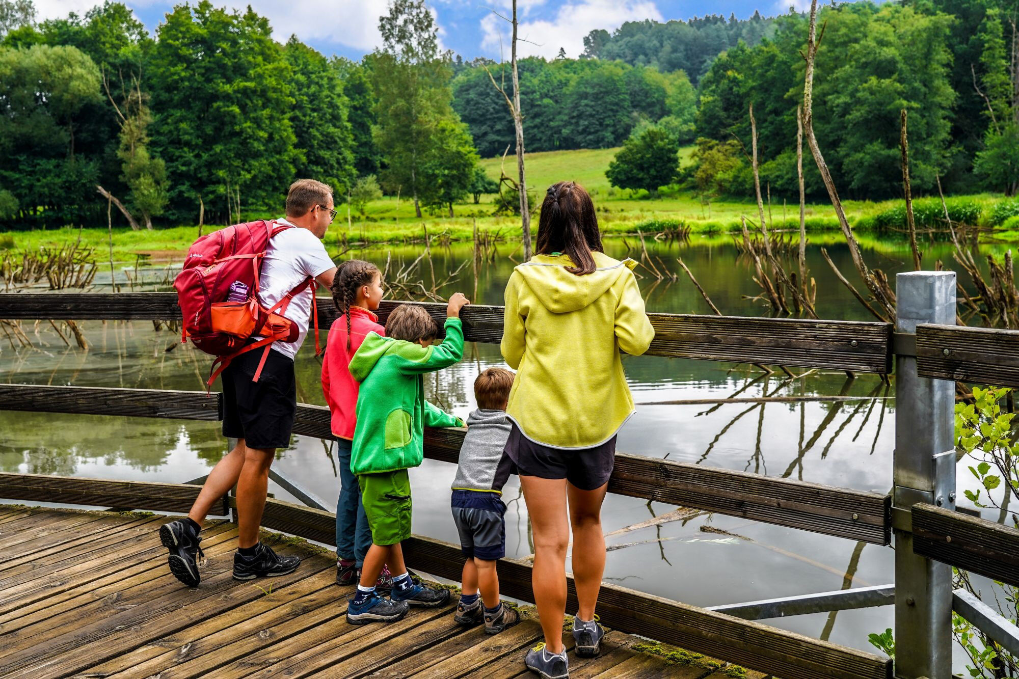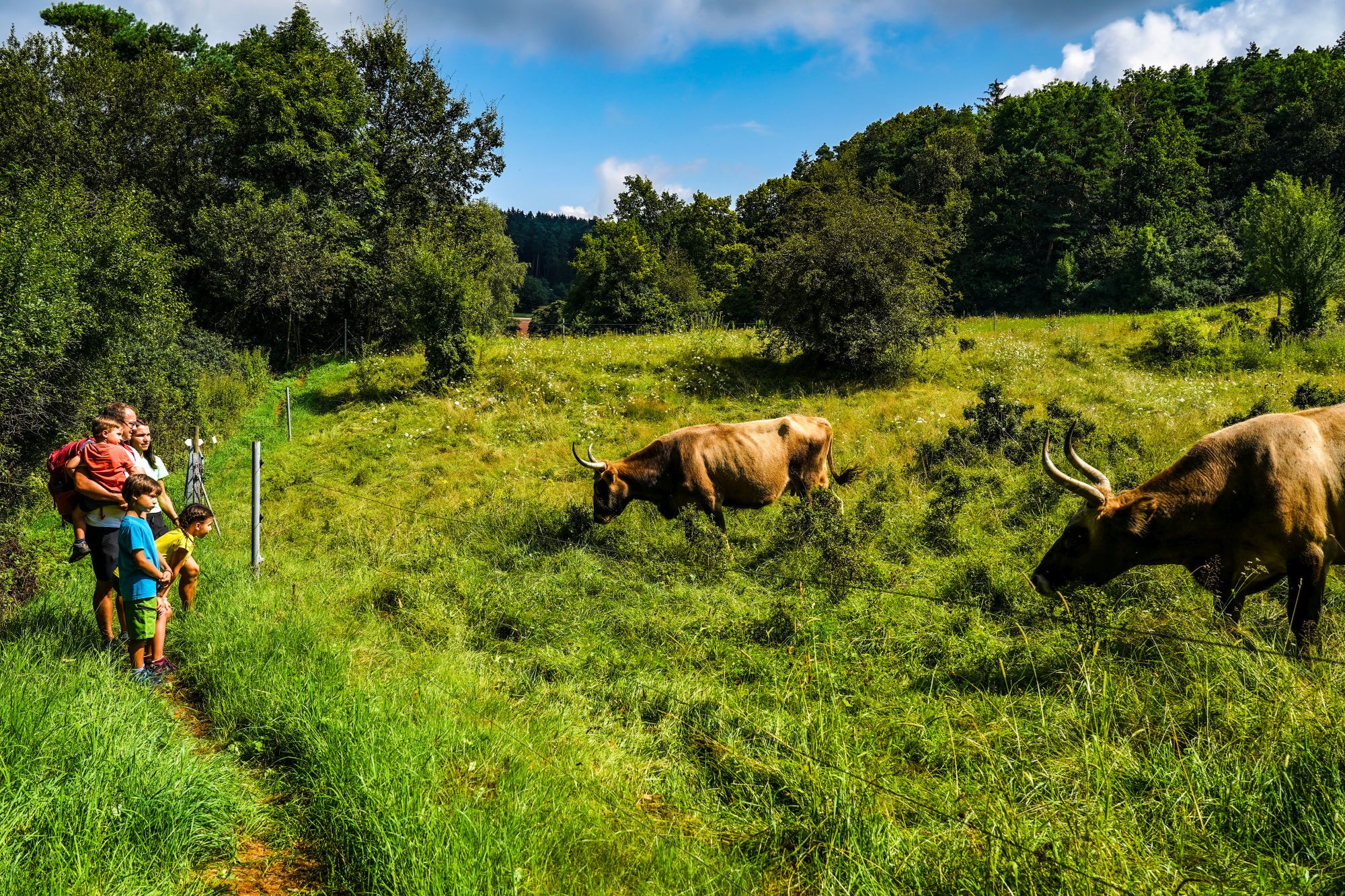 Die Wanderung beginnt am Schützenheim in Degelsdorf. Das rote Schild führt auf die Höhen oberhalb von Degelsdorf. Vom Eichelberg bietet sich ein wunderbarer Überblick auf das Gelände, das den Auerochsen als Heimat dient, und einen herrlichen Ausblick auf die Stadt Auerbach. Anschließend geht es leicht bergab ins Speckbachtal.
