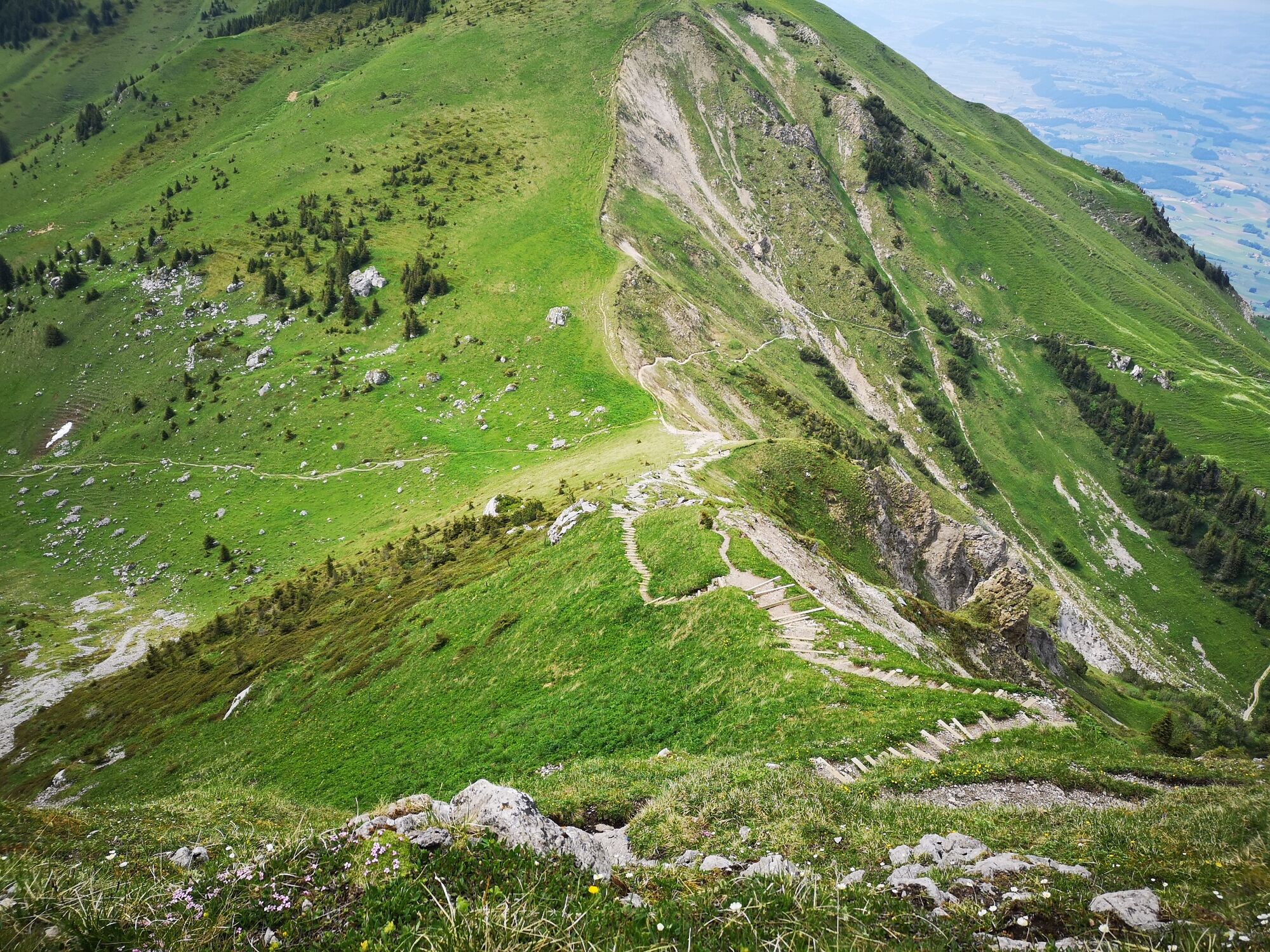 Dort angekommen, steht man am Fusse der gewaltigen Felswand des Stockhorns, welche nun erklommen wird. Der finale Aufstieg sollte nicht unterschätzt werden, denn vor einem liegen Unmengen Treppen. Im Zickzack schlängelt sich der Weg nach oben, bevor der erlösende Blick auf die Bergstation erhascht werden kann. Wer will, kann die letzten Höhenmeter noch auf den Stockhorn Gipfel für ein wunderbare Panoramasicht zurücklegen oder man geniesst die Aussicht vom Restaurant aus.