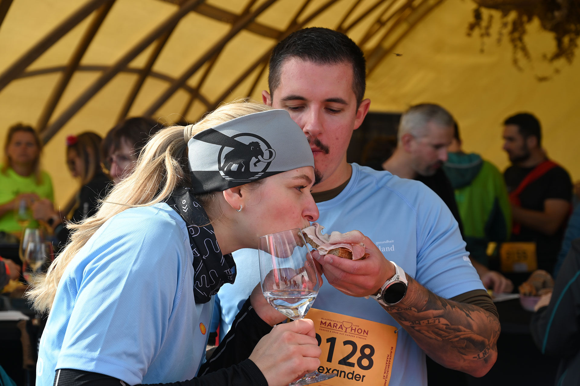 At a total of 13 gourmet stops along the marathon route, you will have the opportunity to taste the excellent wines of local winegrowers and enjoy typical regional delicacies and specialities. Mineral water, still water and grape juice are also available. Most of these enjoyment stations are located in the wineries in the respective local area, many of which impress with cosy courtyards, elegant tasting rooms or beautiful panoramic terraces. Some enjoyment stations are also located in the middle of the vineyards in beautiful panoramic locations. Don't miss out on a short break with a good glass of wine here!