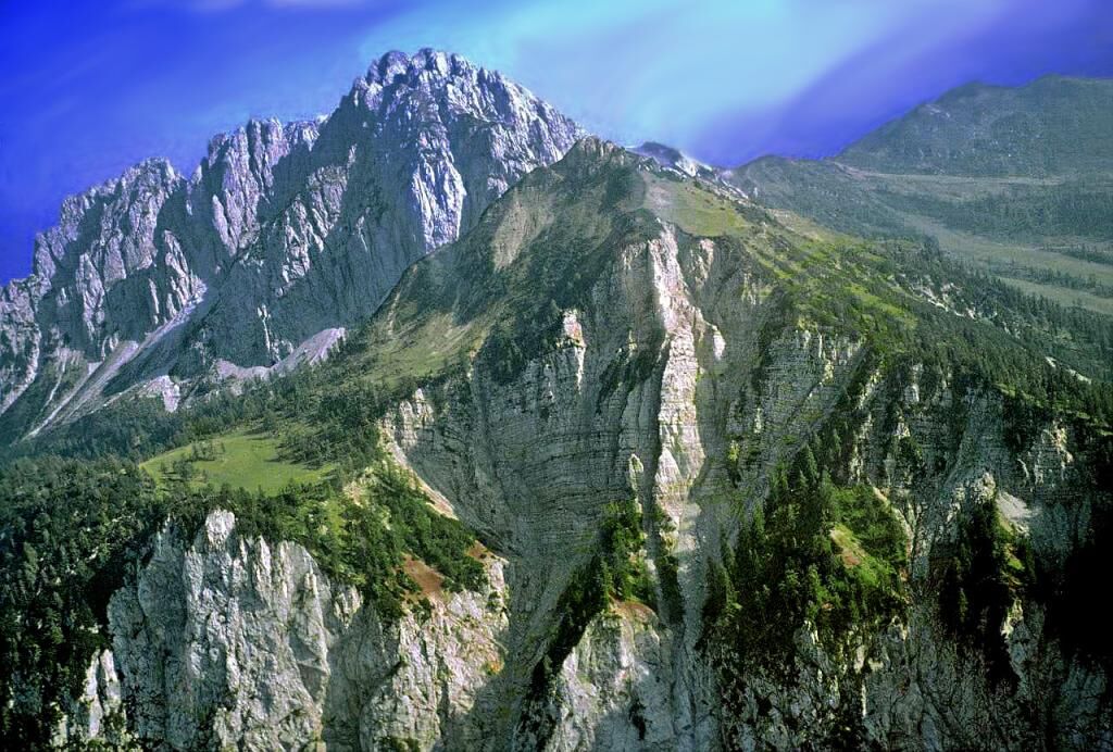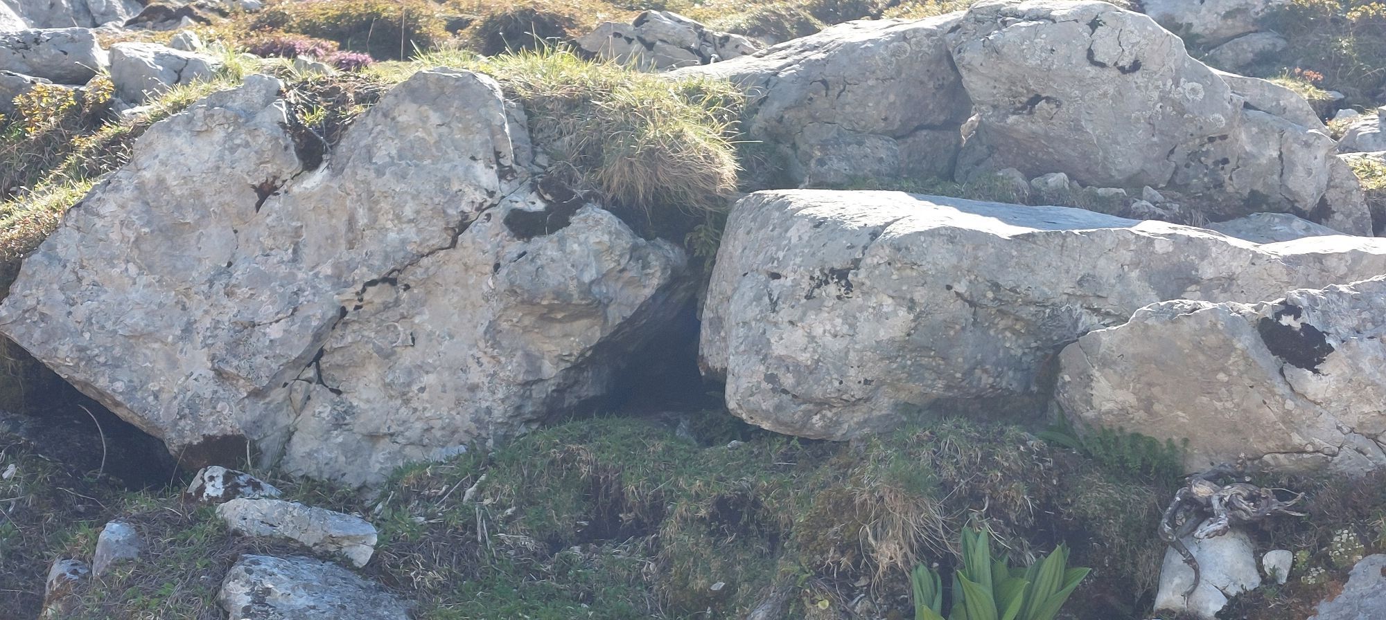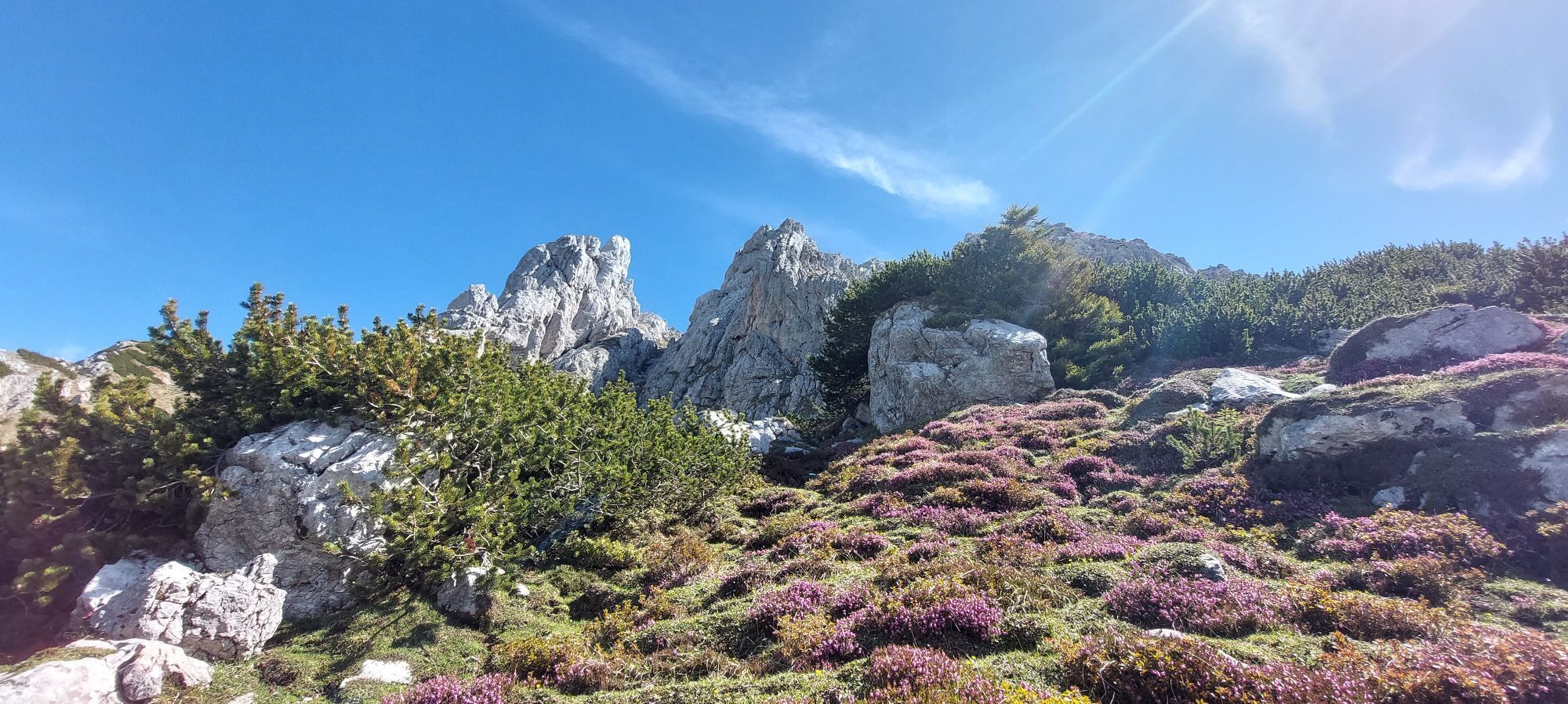 On the way from Watschiger Alm to the Kammleiten, the path crosses shortly before the summit a rock unique to this area. It consists of colorful, decimeter-sized rounded rubble of limestone and dolomite. The rock is referred to as “Muschelkalk conglomerate” or Uggowitz breccia and was formed in the Early Triassic period (about 230 million years ago). The 44 m thick rock forms the entire summit of the Kammleiten, only in the lower part is it interlayered with a layer about four meters thick of green volcanic tuffs. These tuffs could be an indication of formation through an earthquake or a volcanic eruption that shook the seabed and lifted parts of the subsoil over the surroundings. Thus, angular rock debris may have accumulated at the foot of the high block, which was reworked, transported, crushed, and rounded near the coast. The consolidation into a conglomerate occurred due to the weight of the overlying rocks.
