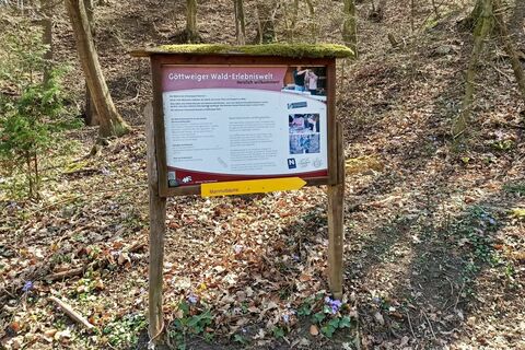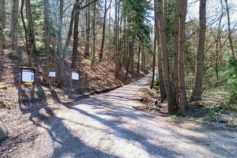Von dort aus folgt man dem Bruckweg weiter in Richtung Süden. Die Straße geht dann in einen Waldweg über. Bei der Weggabelung biegt man links ab. Nach einer Linkskurve kommt man erneut zu einer Weggabelung. Hier folgt man nicht dem Schild "Mammutbäume", das nach rechts weist, sondern geht links weiter. Der Weg ist von zahlreichen von Schüler*innen eines Kremser Gymnasiums gestalteten Infotafeln gesäumt und führt in einer langen Rechtskurve bergauf und macht dann eine Rechtskehre und eine etwas größere Linkskurve. Danach wird der Weg flacher.
