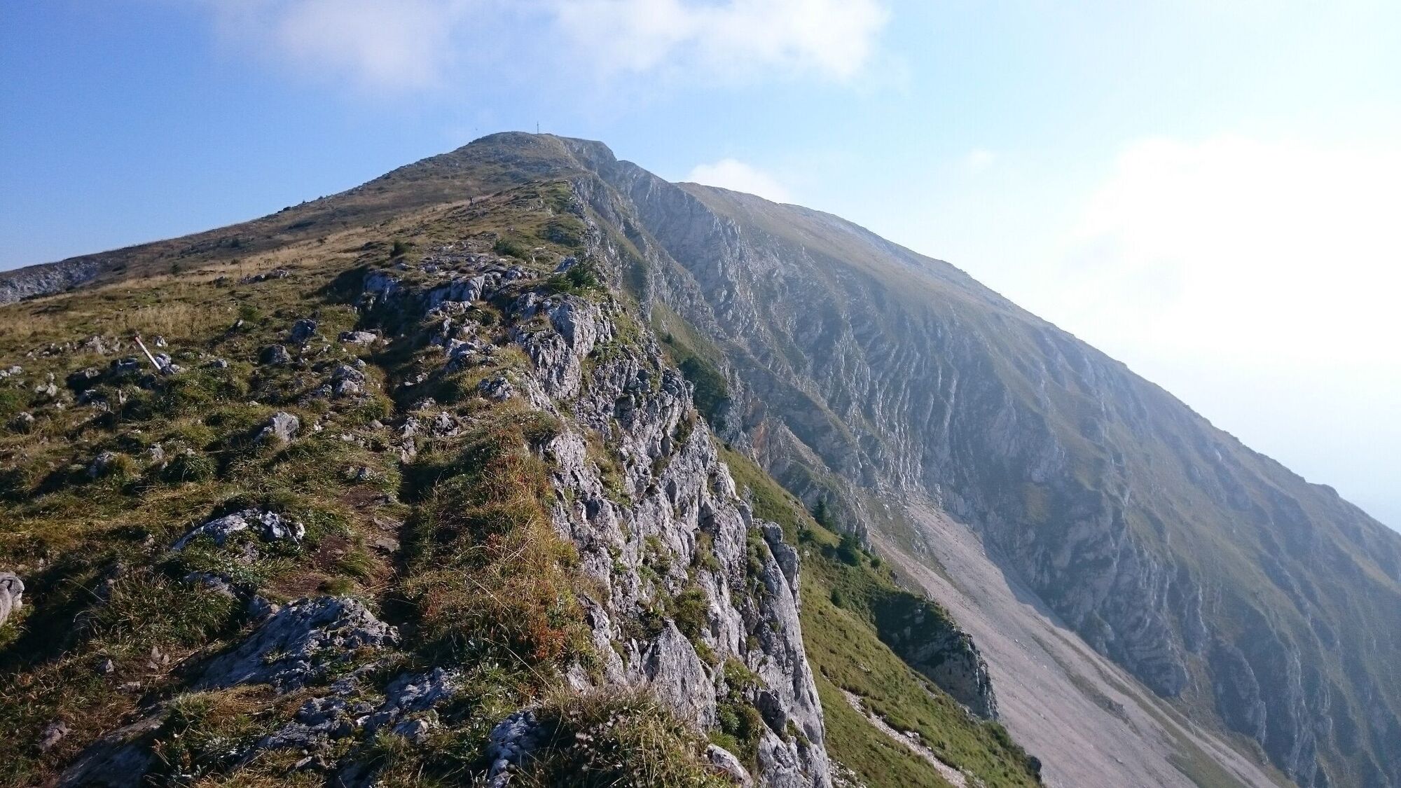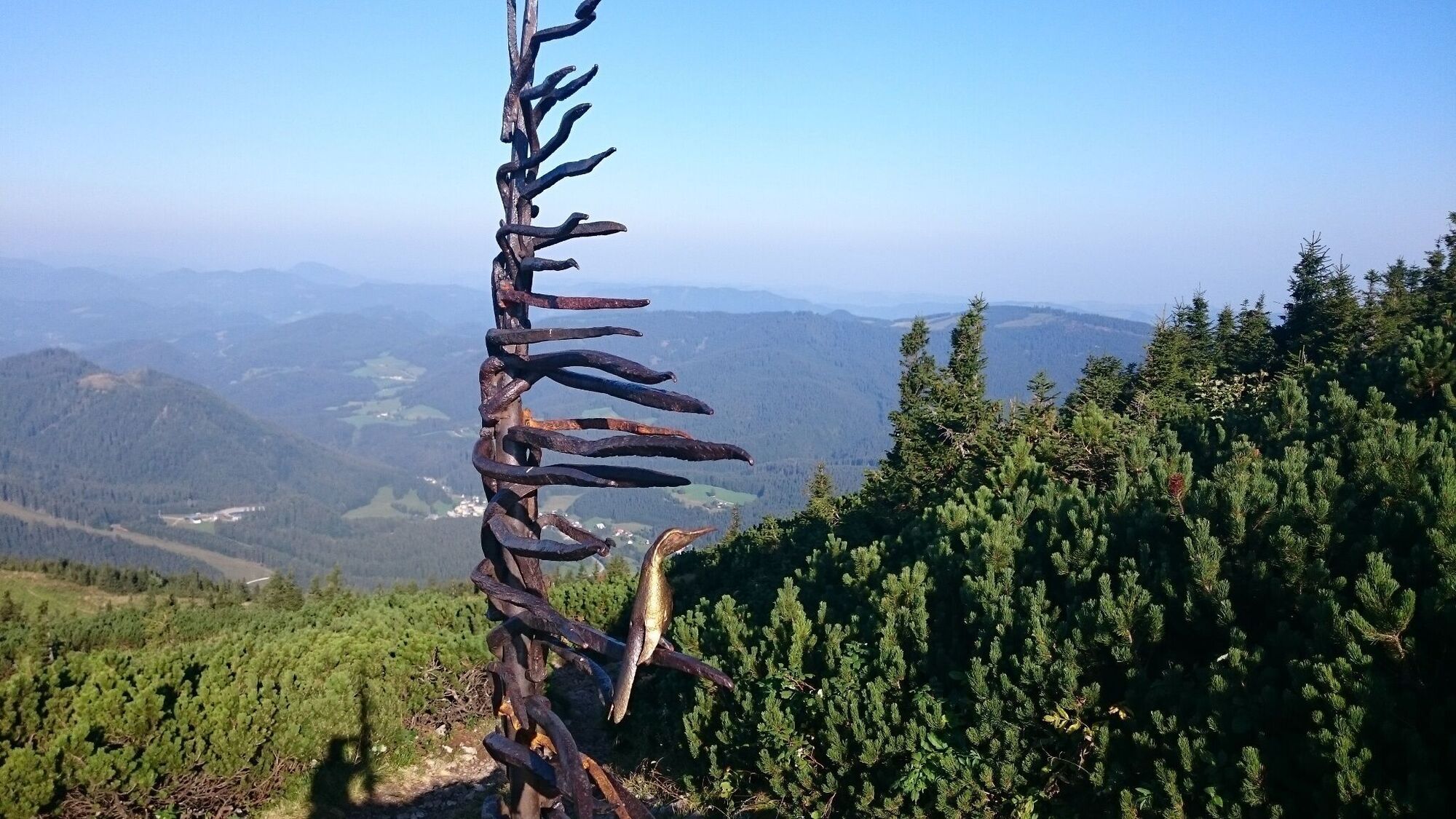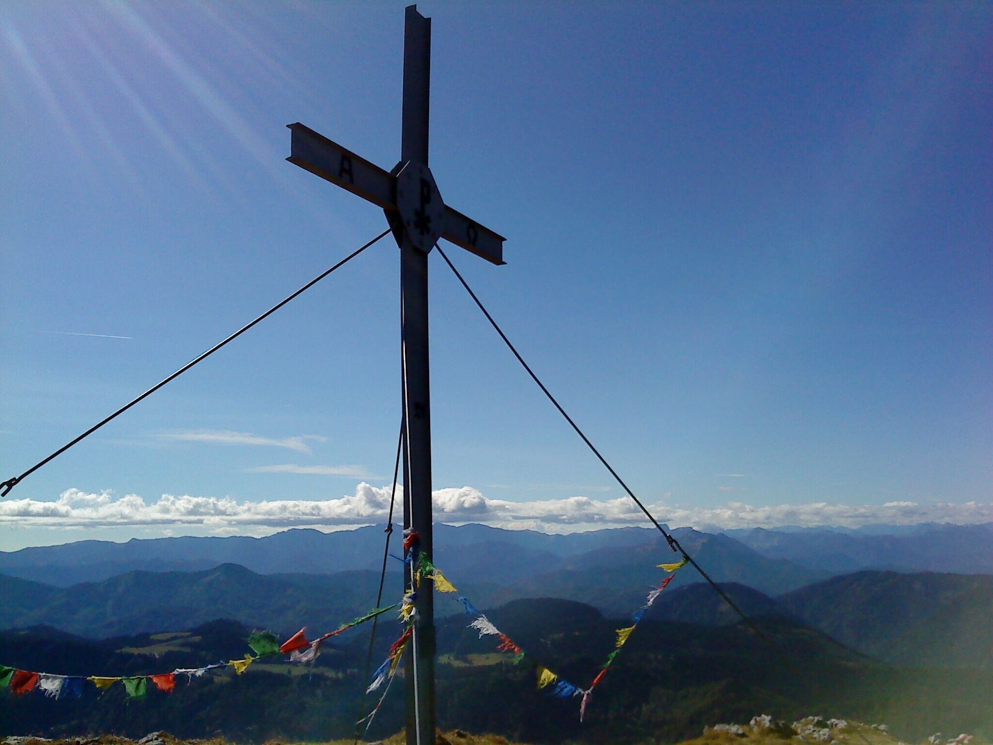 Ab der Bergstation geht es auf einem bequemen Spazierweg in einigen Serpentinen über die rasenbedeckte "Wiesmahd" hinauf zum Hüttenkogel. Bei klarem Wetter empfiehlt sich ein Blick durch das Panoramafernrohr (ca. 15 min., 1520m Seehöhe), denn bereits hier hat man einen herrlichen Ausblick auf das Bergpanorama im Süden und Westen sowie auf die Hügelketten nördlich des Ötschers. Der markierte Weg dreht bereits vor dem Panoramfernrohr nach links in Richtung Osten, steiler bergan über den steinigen Felsrücken mit immer großartiger werdendem Ausblick. Bei einer felsigen Verengung des Kammes, dem "Weißen Mäuerl", sieht man zum ersten Mal das Gipfelkreuz. Über die rasenbedeckte Verflachung hinweg, besonders reizvoll am Grat entlang mit herrlichem Tiefblick in das südliche Kar, geht es weiter zum steileren Anstieg des Kreuzkogels mit dem kleinen Gipfelplateau ( 1893m Seehöhe, ca 1 1/4 Std.).