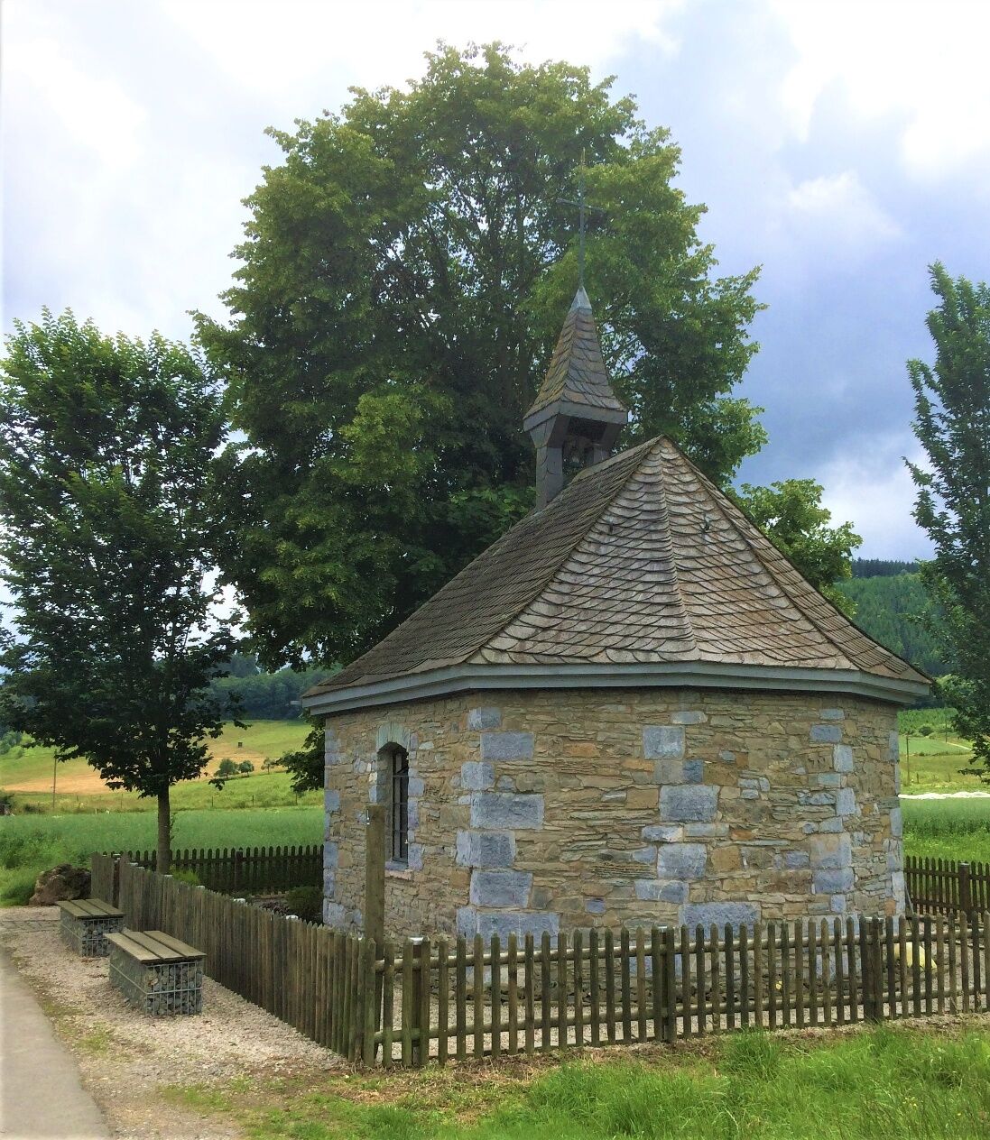From the church, continue uphill along Huxenweg until the paved path turns left. With wide views, you now hike over the "Scheed" and almost at its end come across the hiking sign E in a circle, which you follow. Shortly before the Heiligenfeld chapel, it turns right into a meadow path that leads into the Bönkhausen stream valley (you will pass the chapel again later). In the valley, turn left and you reach the little chapel of Bönkhausen (information board). Here you cross the country road and continue following the E in a circle. Behind the Waldwinkel farm, turn left and along former mining traces reach the bench at Druberg. Here you leave the E in a circle and now follow the inverted T back to Endorf, but not without visiting the Heiligenfeld chapel again. The inverted T ends at the village pond with the large information board. From here, it is only a few steps back to the church, the starting point of your hike.