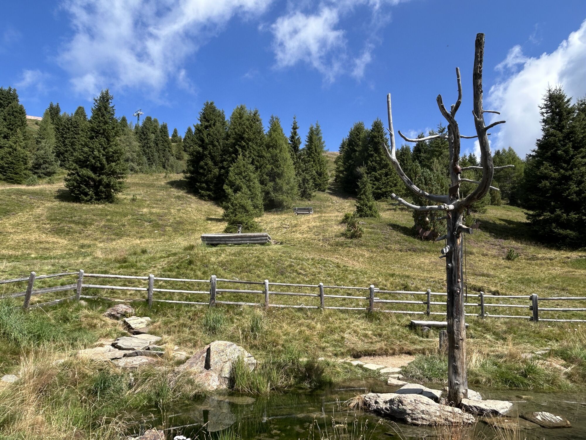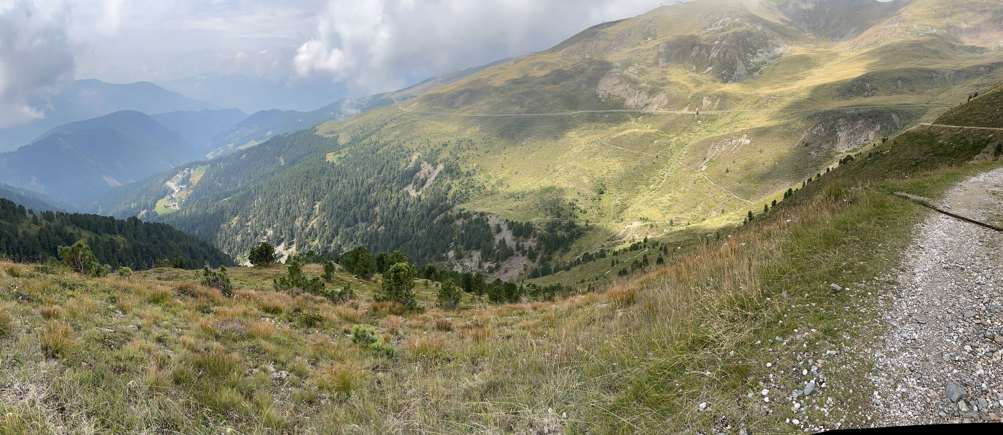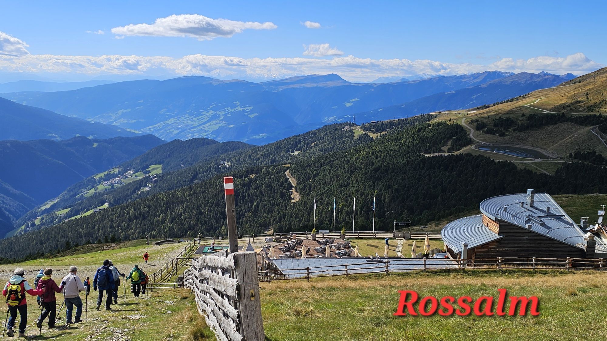 To return, head south along the mountain track on trail no. 7 to the mountain pasture trail (2,320 m) and then west following trail no. 14 to the Rossalm mountain hut (2,180 m), for a rest stop. From there, it is an easy hike to the mountain station of the gondola lift at Kreuztal.