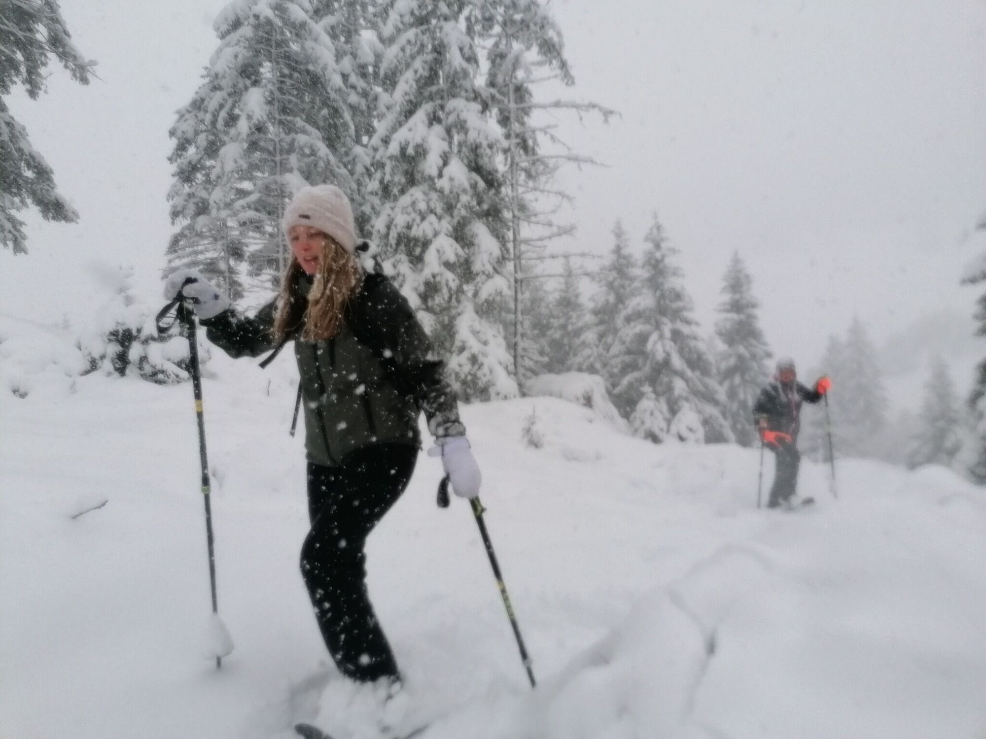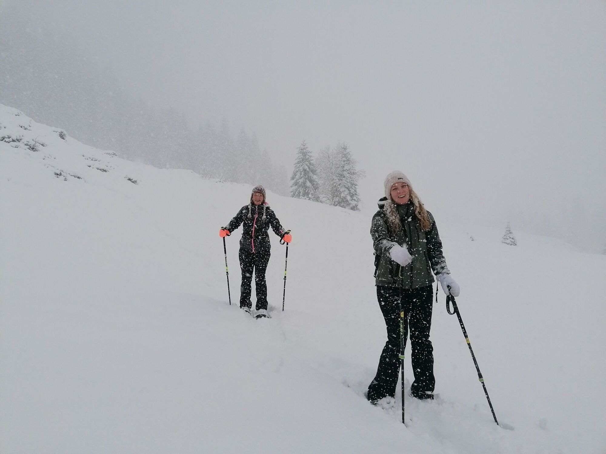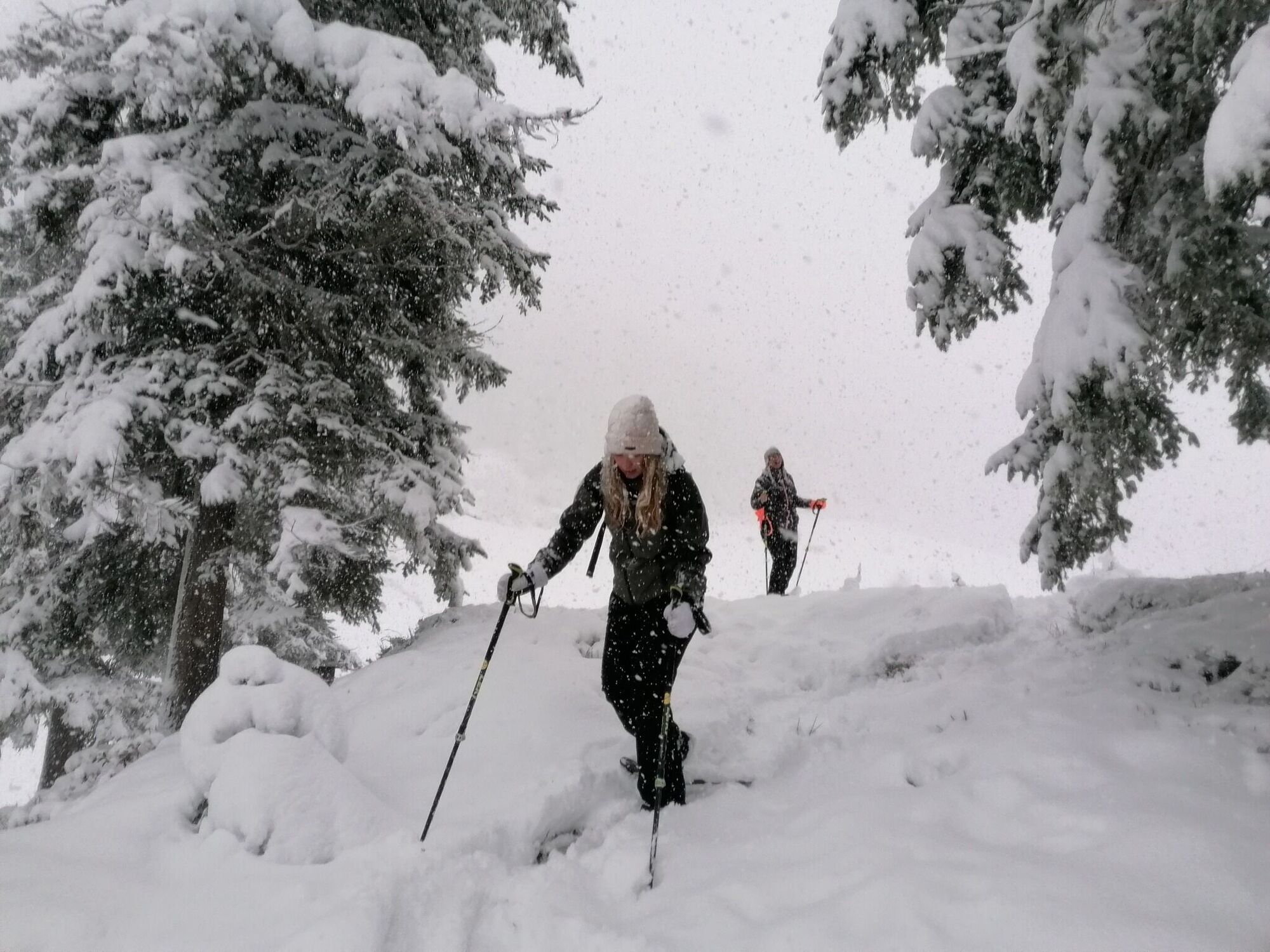 feste, wasserdichte Bergschuhe, Schneeschuhe, Stöcke, Verpflegung, LVS Ausrüstung
